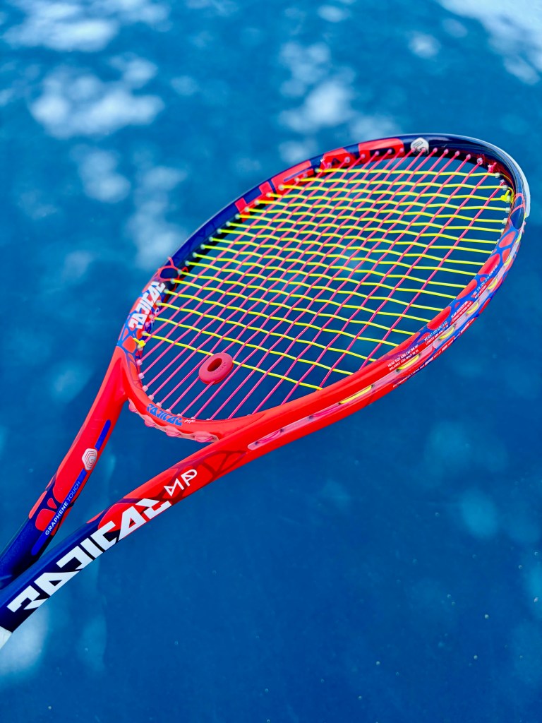 Thing is, I don’t get many warm fuzzys from new rackets. No, for some reason I get the biggest charge out of rackets that are a few years old but still in great shape. That accounts for the appeal of my first (as in first racket purchased by me) racket, a Wilson Six.One 100, codename: Battle Ax in Tennis thing the audiobook. There’s a graphics sweet spot I like and it’s exemplified by my latest purchase, a Head Radical MP Graphene Touch. I snagged it for $50 at the Tennis Warehouse Store in SLO and had it strung today with Toroline K-Pop. Check it out: